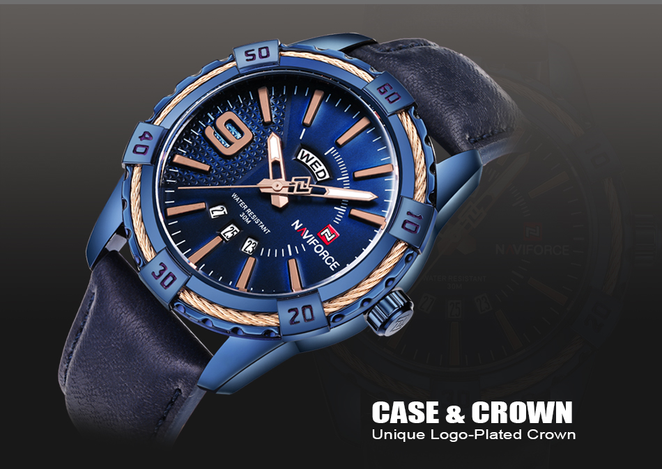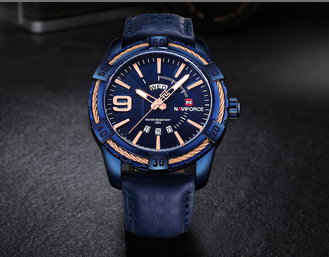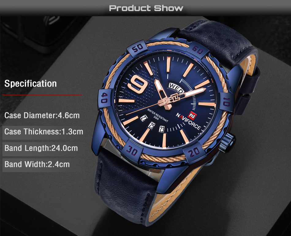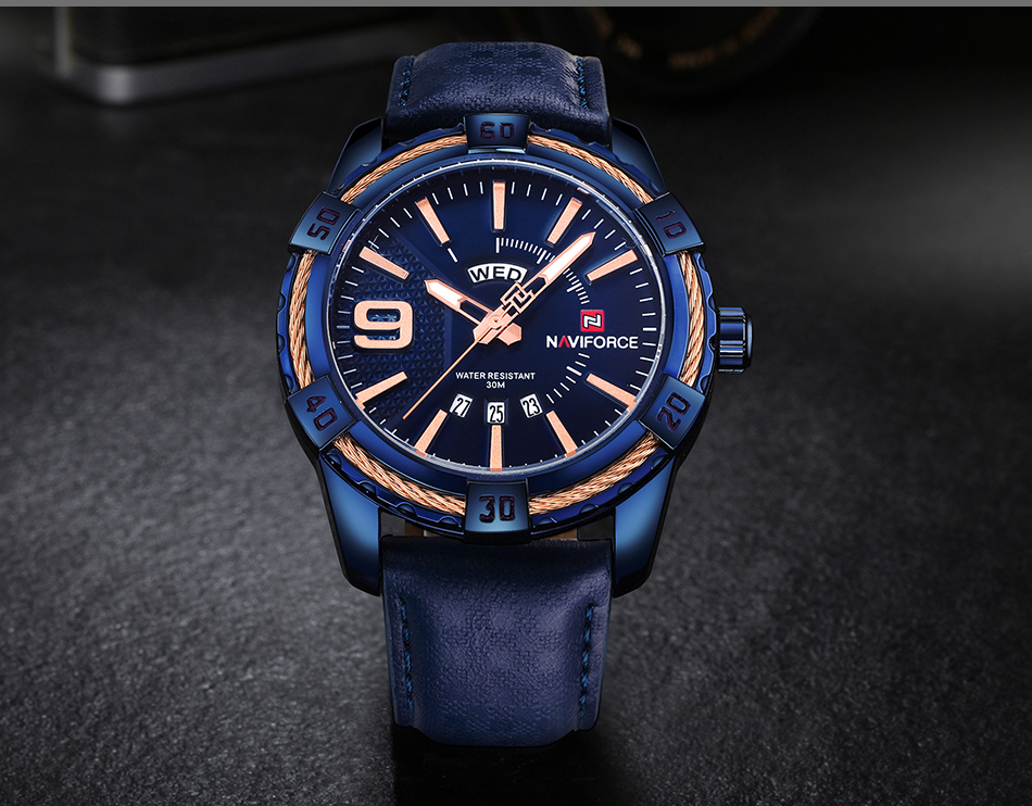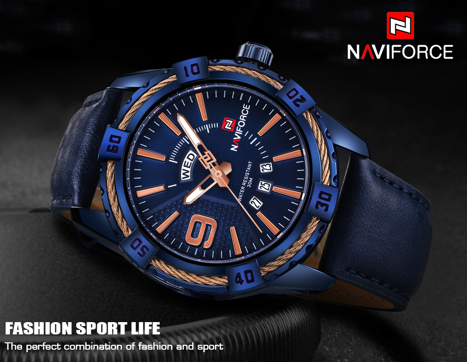 นาฬิกาข้อมือผู้ชาย จาก NAVIFORCE ของแท้ หน้าปัทม์แสดงวัน และวันที่ นาฬิกาข้อมือ NAVIFORCE ของใหม่แท้ สายหนัง สีน้ำเงินรุ่นใหม่ออกแบบให้มีลักษณะเรียบหรู ดูดีมีไสต์ ทรงสปอต์ พร้อมหน้าปัทม์แสดงวัน และวันที่ มองได้ชัดเจนโดดเด่น มาพร้อมกล่องใส่เฉพาะรุ่นนี้เท่านั้น