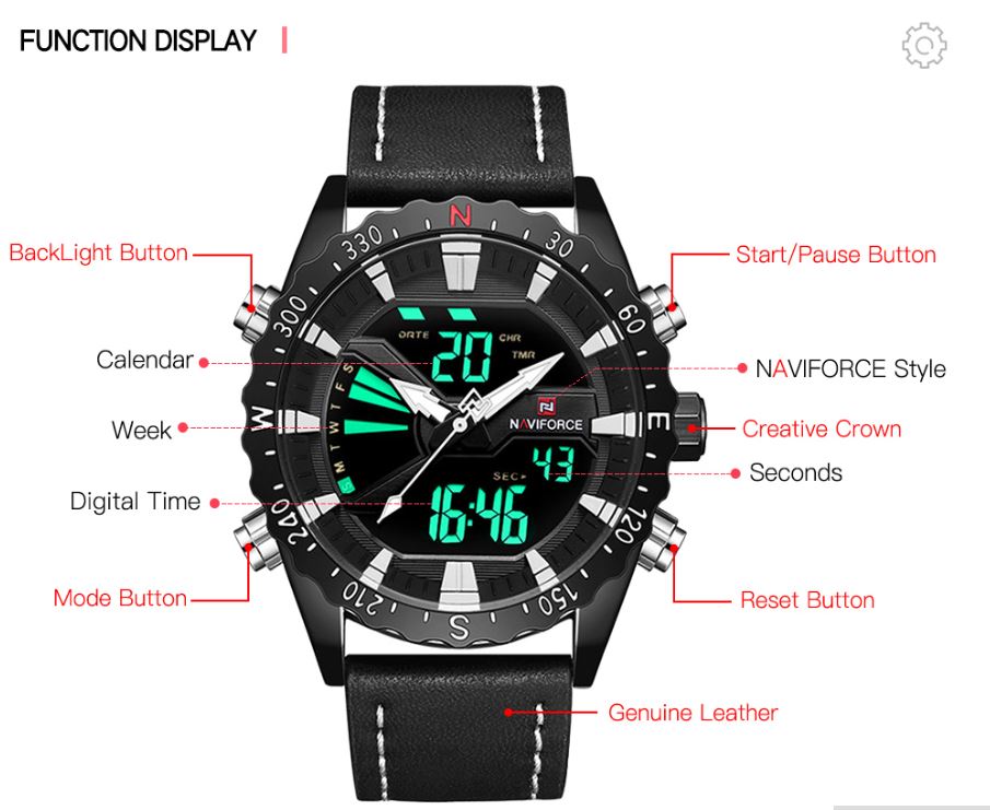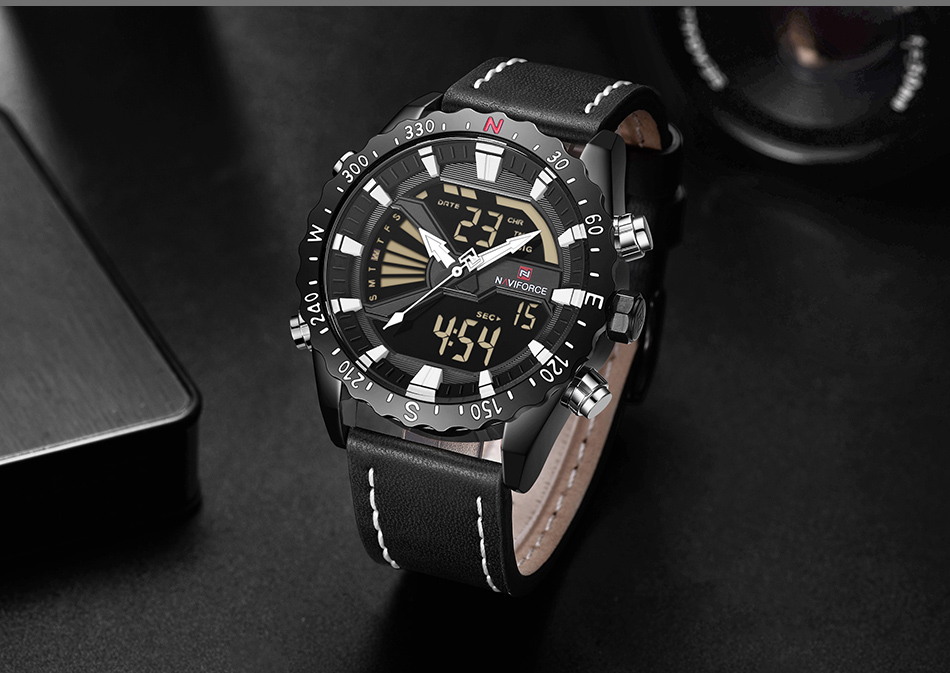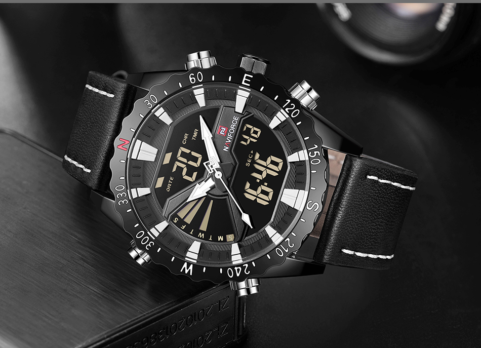 นาฬิกาข้อมือผู้ชาย จาก NAVIFORCE ของแท้ หน้าปัทม์แสดงผลทั้งดิจิตอล และอนาล๊อค แสดงวัน และวันที่ นาฬิกาข้อมือ NAVIFORCE ของใหม่แท้ สายหนัง รุ่นใหม่ออกแบบให้มีลักษณะเรียบหรู ดูดีมีไสต์ พร้อมตัวเลขขนาดใหญ่มองได้ชัดเจนโดดเด่น แม้ในที่มืด หน้าปัทม์แสดงวัน และวันที่ด้วย มาพร้อมกล่องใส่เฉพาะรุ่นนี้เท่านั้น