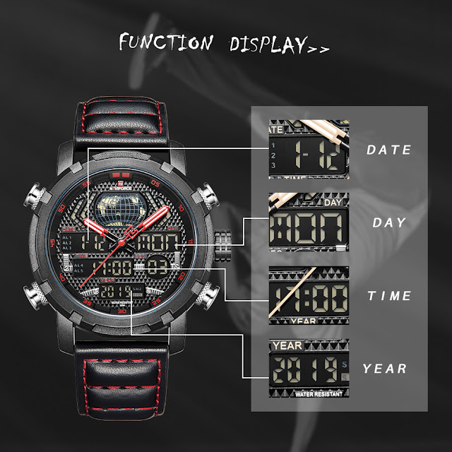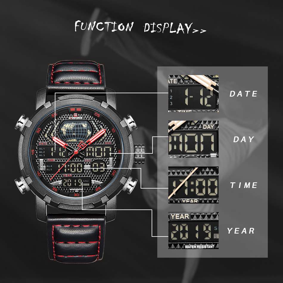 นาฬิกาข้อมือผู้ชาย จาก NAVIFORCE ของแท้ หน้าปัทม์แสดงผลทั้งดิจิตอล และอนาล๊อค แสดงวัน วันที่ เดือน และปี นาฬิกาข้อมือ NAVIFORCE ของใหม่แท้ สายหนัง รุ่นใหม่ออกแบบให้มีลักษณะเรียบหรู ดูดีมีสไตล์ พร้อมลายกราฟฟิกแผนที่โลก บนหน้าปัทม์ สวยงาม โดดเด่น ตัวเลขขนาดใหญ่มองได้ชัดเจนโดดเด่น แม้ในที่มืด มาพร้อมกล่องใส่เฉพาะรุ่นนี้เท่านั้น